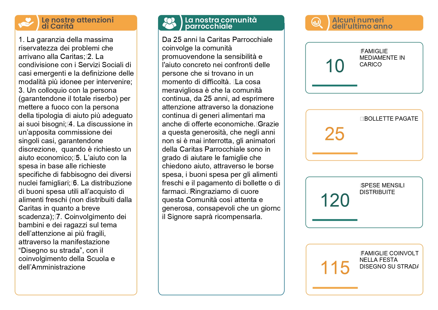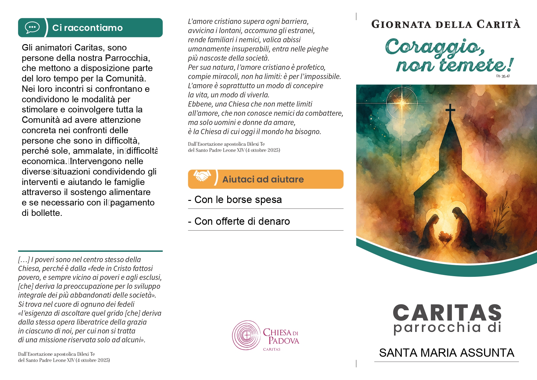 La caritas parrocchiale in sinergia con la caritas della Diocesi di Padova è sensibile a sostenere con la preghiera e con aiuti economici le famiglie colpite da calamità naturali, dalla guerra e dalla fame.
